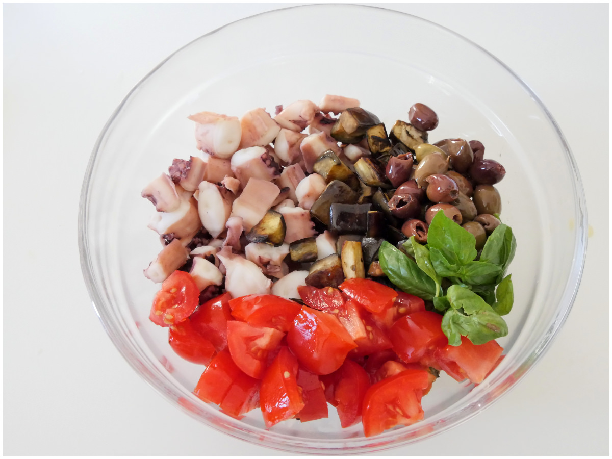 Infine, quando tutti gli ingredienti saranno pronti, assemblate l'insalata: mettete in una ciotola il polpo ormai freddo, le olive denocciolate, i pomodorini, le melanzane e tanto basilico fresco e condite con un filo d'olio e poco sale.
