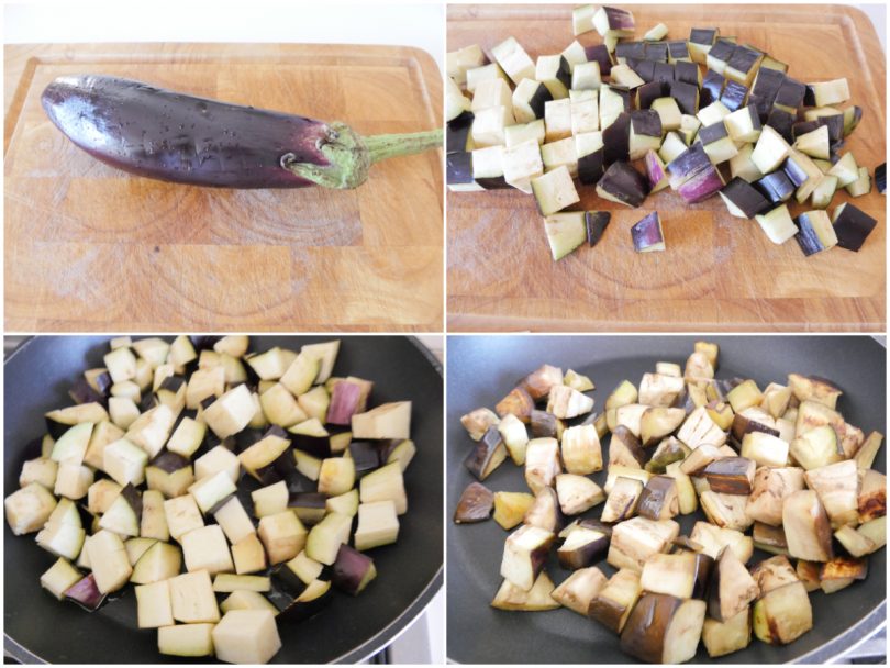 Lavate e mondate le melanzane e tagliatele a cubetti, quindi fatele rosolare con un po' di olio e sale in una padella antiaderente, facendole dorare bene da tutti i lati.