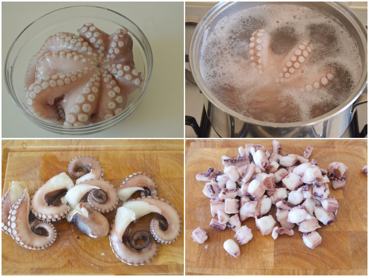 Innanzitutto bollite il polpo per circa 1 ora dal momento dell'ebollizione, quindi scolatelo e tagliatelo a tocchetti.