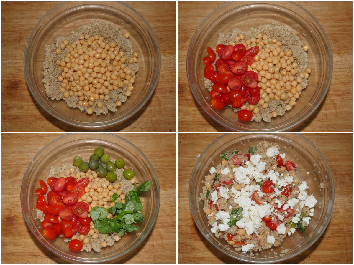 Assemblate il piatto: unite alla quinoa i ceci, i pomodorini, le olive, il basilico e la feta sbriciolata; in ultimo aggiungete anche l'emulsione.
