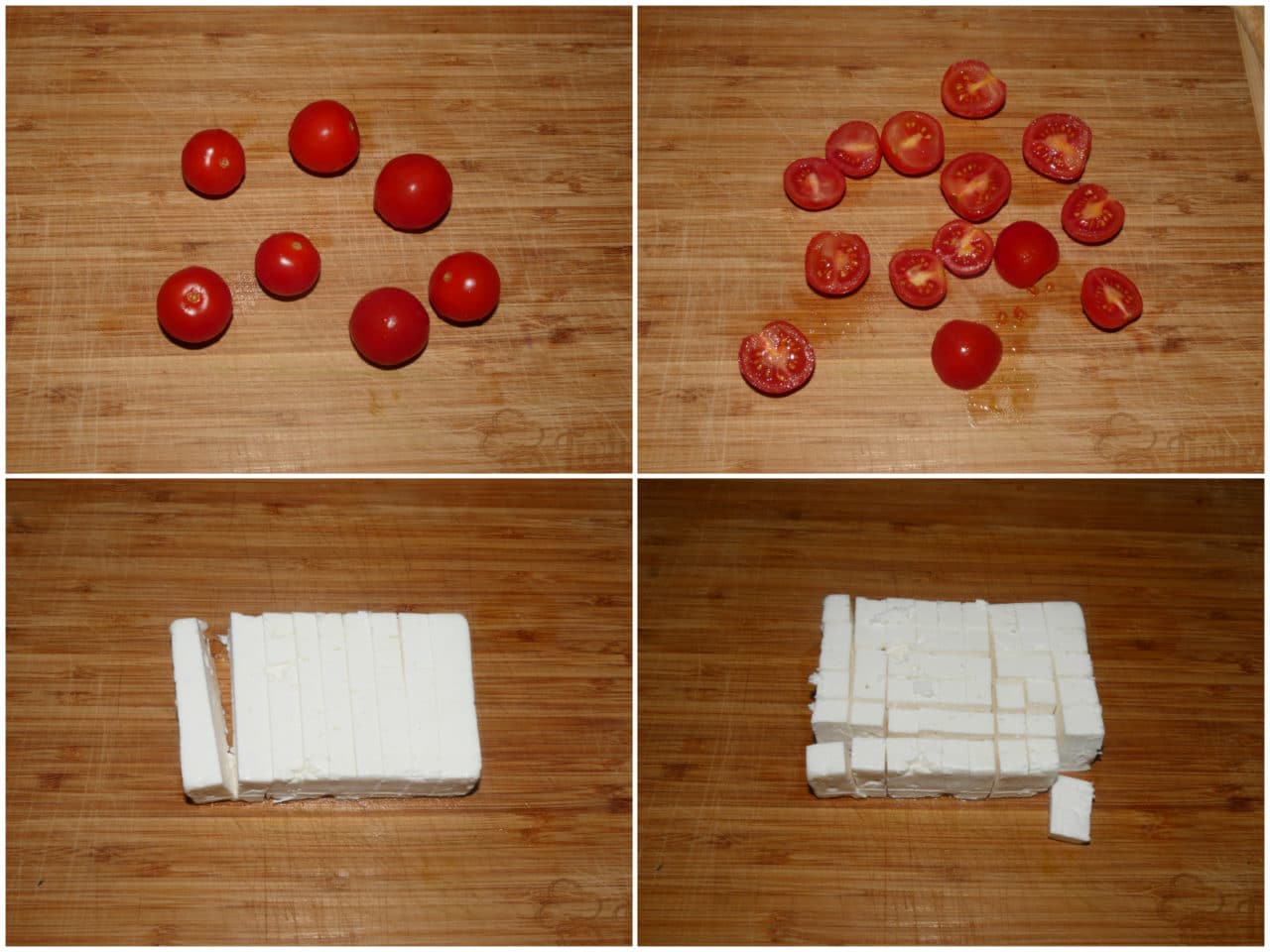 Nel frattempo preparate il condimento. Lavate e tagliate i pomodorini a metà e la feta a cubetti.
