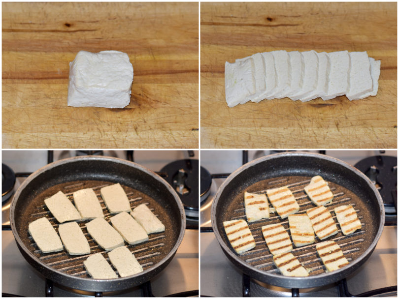 Innanzitutto tagliate il tofu a fettine e grigliatelo su di una bistecchiera arroventata, basteranno pochi minuti per lato.