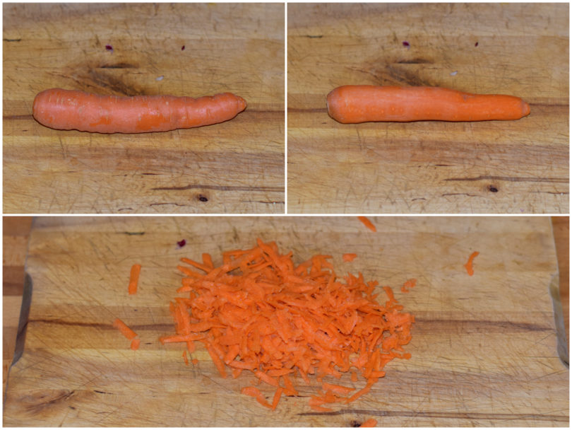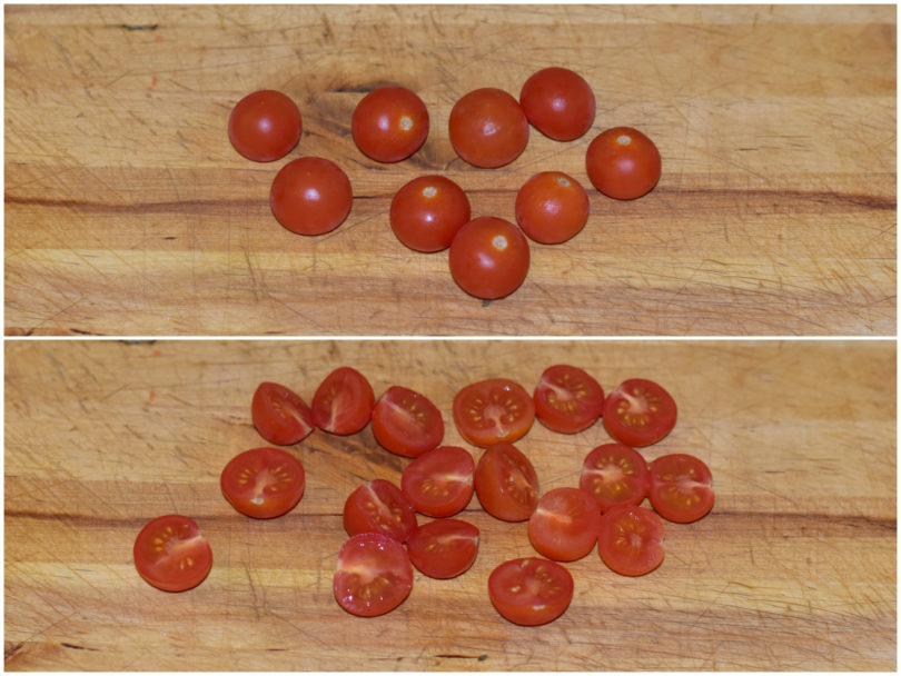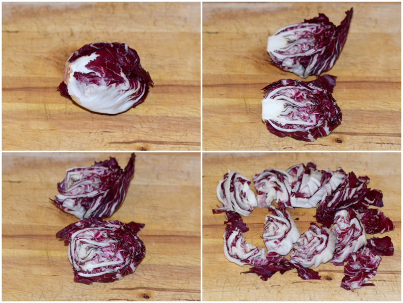 Nel frattempo preparate le verdure: mondate il radicchio e tagliatelo a listarelle, mondate la carota e grattugiatela alla julienne con una grattugia a fori larghi, lavate i pomodorini e tagliateli a metà (o in più parti, se sono grandini).