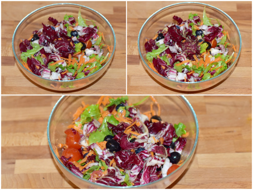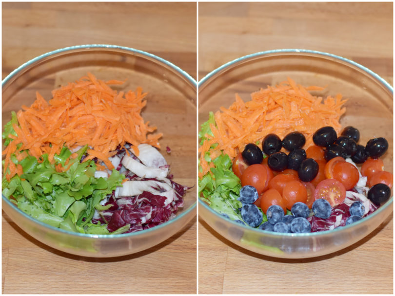 Unite in una ciotola lattuga spezzettata, carote, radicchio, olive denocciolate, pomodori, mirtilli lavati.