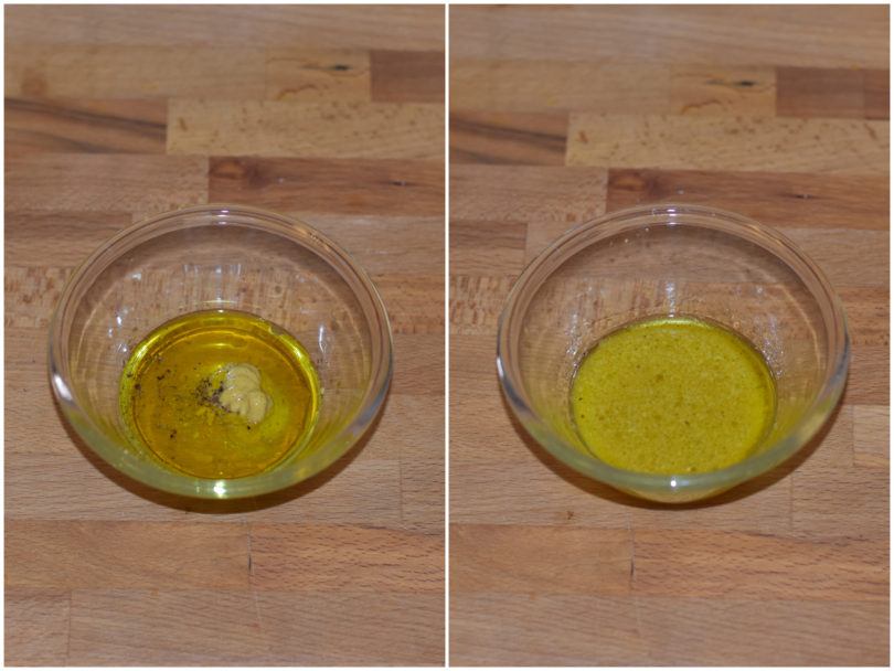 Preparate un'emulsione con aceto, limone, senape, olio, sale e pepe e condite l'insalata, mescolando delicatamente.