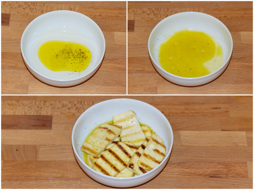 Mescolate in una ciotola 1 cucchiaio di aceto di mele, 1 cucchiaio di succo di limone, sale, pepe e un pochino di olio, poi unite il tofu grigliato e lasciatelo insaporire.