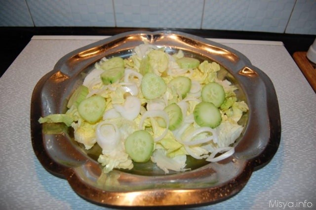 Su un piatto da portata stendete un letto di lattuga, ricoprite con i cetrioli e il cipollotto