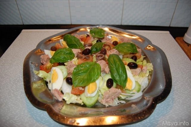 Ieri sera ci ho provato, mi sono scervellata per trovare qualche ricetta light da preparare e inserire nel mio ricettario e quando stavo per rinunciare, ho trovato una ricetta che ha solleticato il mio interesse... l'insalata nizzarda. Una ricetta francese, della costa azzurra, che consiste in un piatto a base di verdure fresche, arricchite con uova sode, pomodori, acciughe, peperoni e olive (di questa insalata c'è anche una variante ligure prevede l'aggiunta di patate e fagiolini lessi) il tutto condito con olio extravergine d'oliva, sale e pepe. L'insalsata nizzarda o salade niçoise ha accompagnato la nostra cena di ieri e nella sua semplicità ha conquistato tutti, decisamente da rifare :) Con questa ricetta spero di aver accontentato chi era alla ricerca di un bel piatto estivo leggero, non prendeteci gusto però perchè lo sapete che io sono per i dolci e le sfizioserie, bacibaci e buon venerdì.