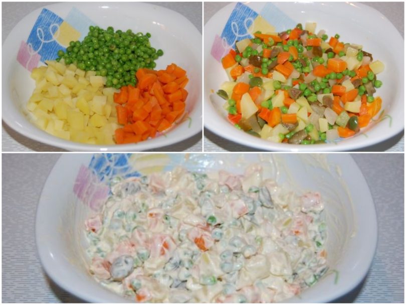 piselli carote uovo salame lessato maionese pepe nero e maionese se vi piace anke un po di cipolla tritata qst sara un insalata italiana no russa