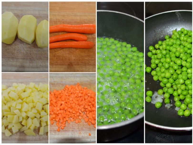 Fate lessare separatamente le carote , le patate e i piselli in acqua bollente e salata.