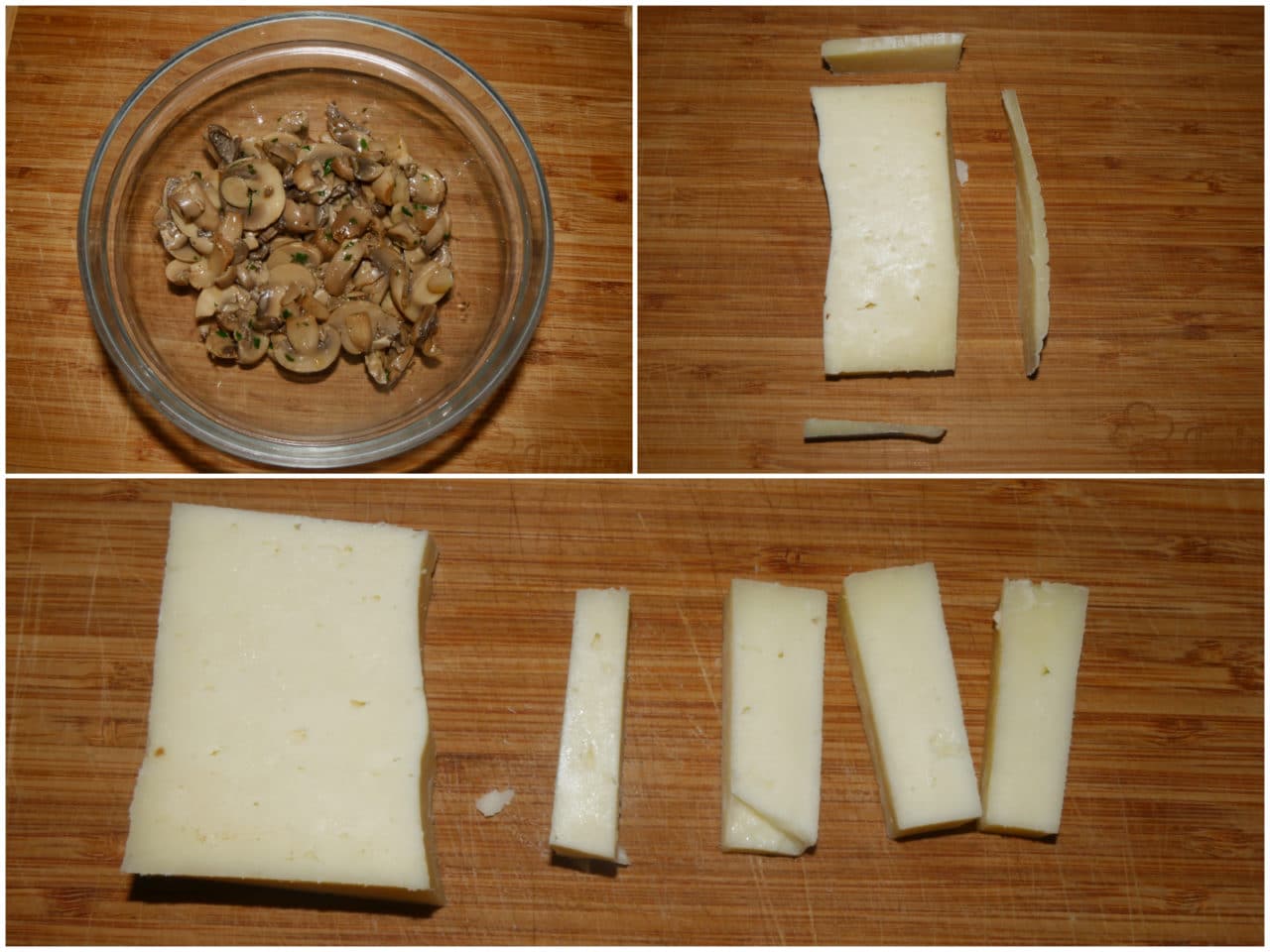 Tagliate il formaggio a bastoncini e predisponete 1/3 dei funghi per il ripieno.