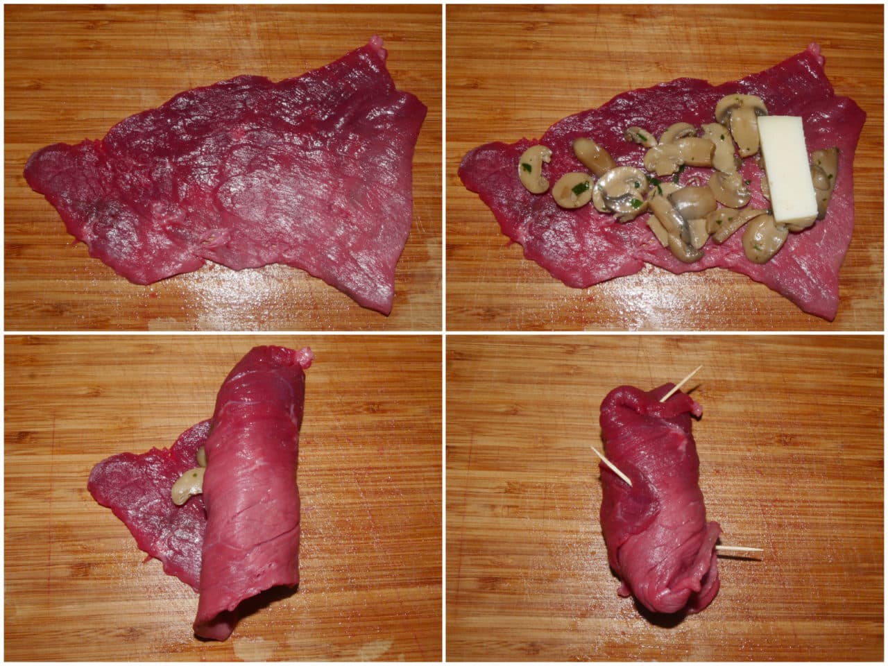 Mettete su ogni fettina di carne un pezzetto di formaggio e un po' di funghi, quindi arrotolate e chiudete con degli stuzzicadenti.