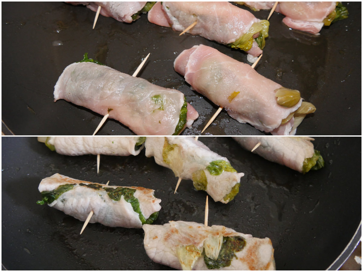 Cuocete gli involtini in una padella antiaderente, con un filo d'olio e un pizzico di sale e pepe, rigirandoli spesso per farli dorare in maniera uniforme.