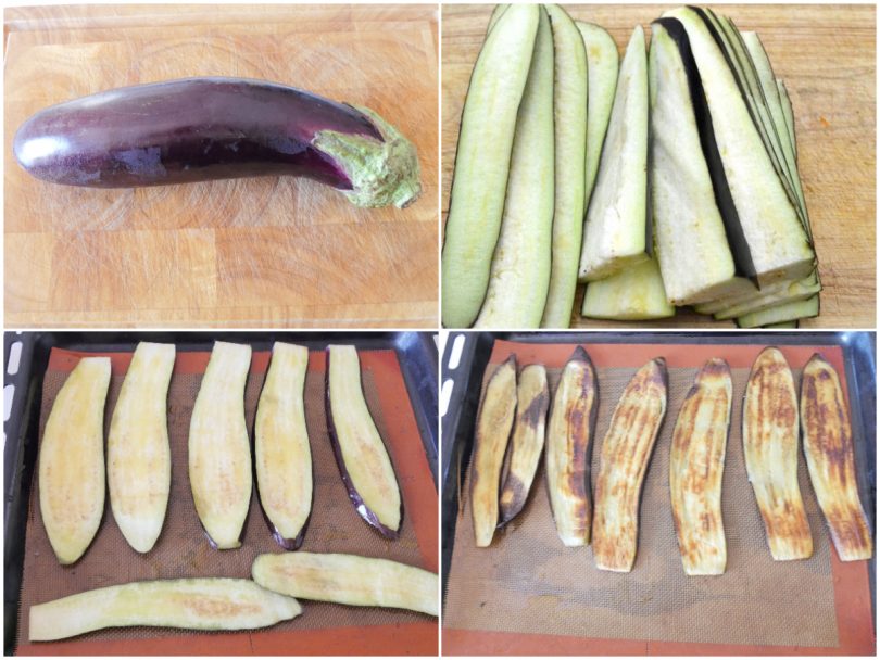 innanzitutto lavate e mondate le melanzane e tagliatele a fette per il lungo, quindi disponetele sulla teglia del forno rivestita di carta forno, conditele con sale e olio e cuocete per circa 15 minuti a 180°C, in forno ventilato già caldo, quindi lasciatele raffreddare.