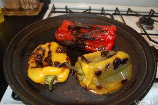 Lavate i peperoni, poggiate su una piastra (o in forno a 200 gradi) e cuocete per circa 20 minuti, rigirandoli sui vari lati fino a che non saranno arrostiti in maniera omogenea.