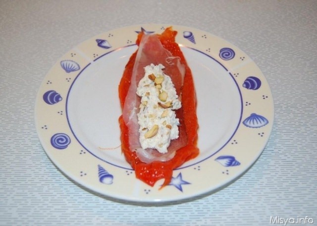 Spalmate sui filetti di peperone arrostito, la crema di ricotta precedentemente preparata e spolverizzate con un pò di pistacchi tritati.