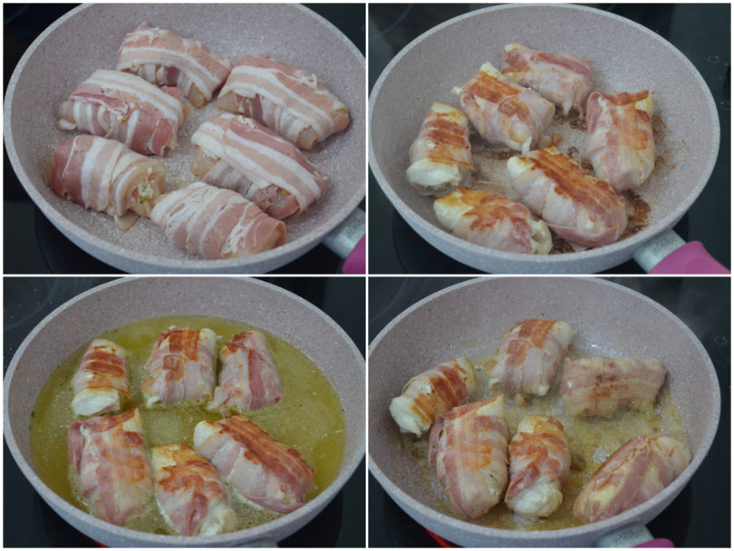 In una padella antiaderente, rosolate gli involtini di pollo al philadelphia rigirandoli su tutti i lati.