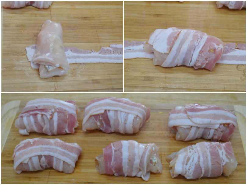 Avvolgere ogni involtino al philadelphia con due fetta di bacon ad incrocio, così da nopn far uscire il ripieno durante la cottura.