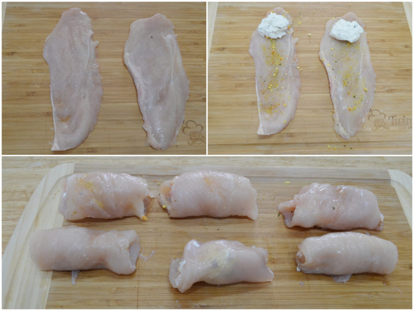 Disponete un cucchiaino colmo di composto sul bordo delle fettine di pollo e richiudetele su se stesse.
