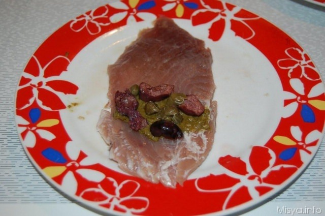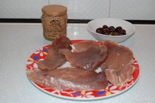 Mio padre mi ha portato delle fettine di filetto di tonno fresco e ho deciso di farci degli involtini, come ripieno ho scelto olive nere di gaeta e capperi di pantelleria accompagnati da un patè di cime di rapa che mi ha fornito Sole&Sale, un negozio online di prodotti tipici regionali.