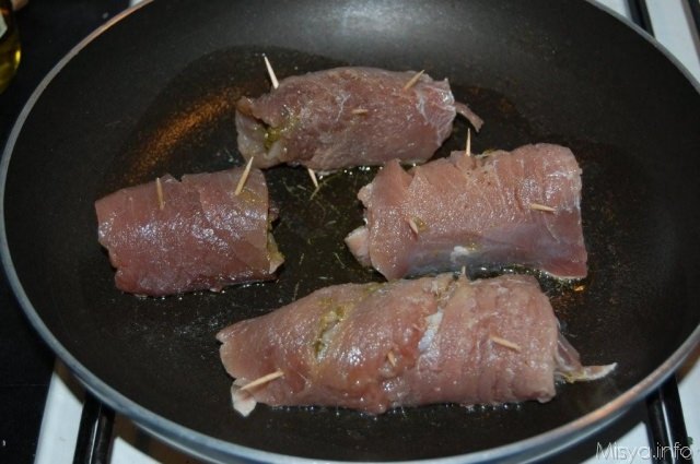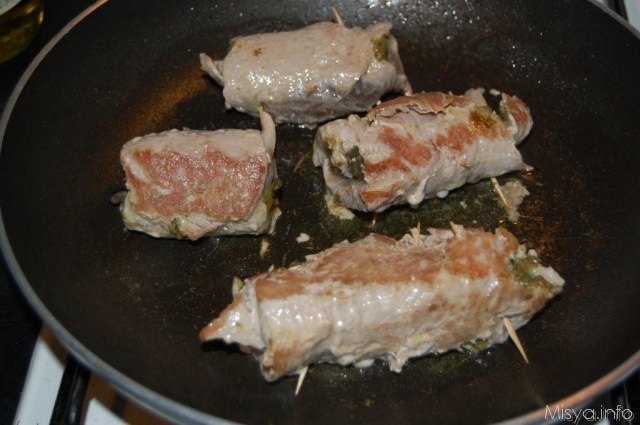 A metà cottura, rigirare gli involtini e sfumare con il vino bianco.