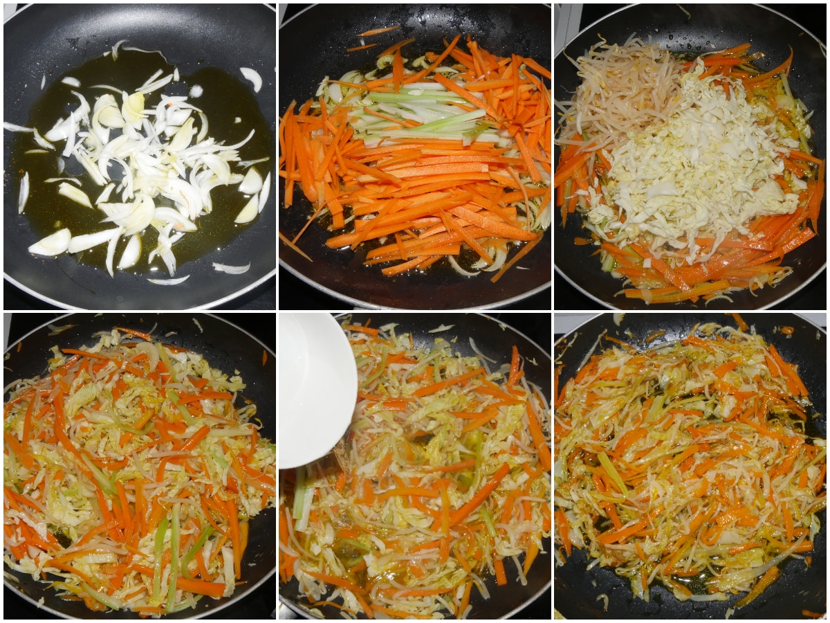 Fate imbiondire la cipolla in un paio di cucchiai di olio di semi, aggiungete a cascata il sedano e le carote e infine i germogli di soia e la verza. Salate, aggiungete 1 tazzina d'acqua, coprite e lasciate appassire le verdure per una decina di minuti.
