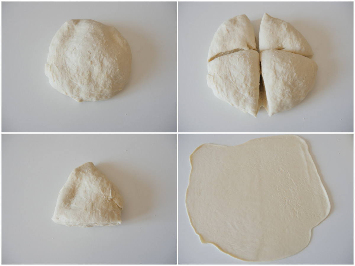 Riprendete l'impasto, dividetelo in 4 parti uguali e stendetele tutte fino a formare delle sfoglie sottili e tondeggianti.