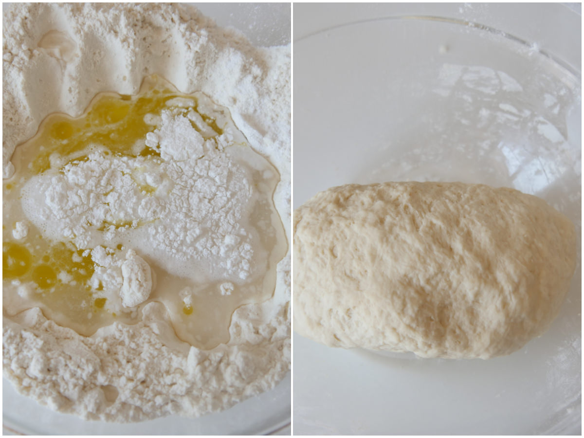Versate la farina in una ciotola, aggiungete al centro lievito, sale, olio e acqua e iniziate ad impastare.