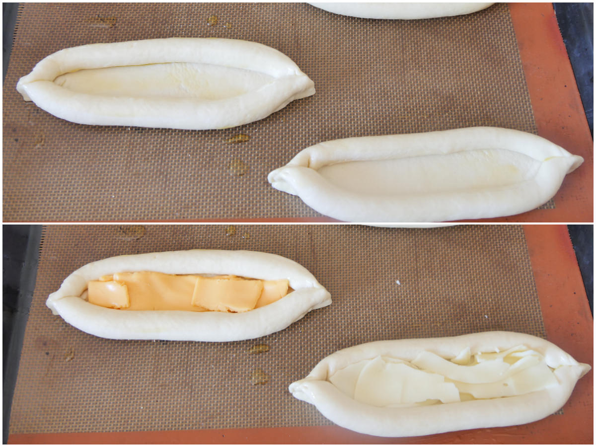 Posizionate le barchette sulla teglia rivestita di carta forno, spennellatele con olio e farcitele al centro con il formaggio tagliato a pezzetti (io ho usato formaggi diversi per le varie barchette), quindi cuocete per 15 minuti circa in forno ventilato preriscaldato a 250°C.