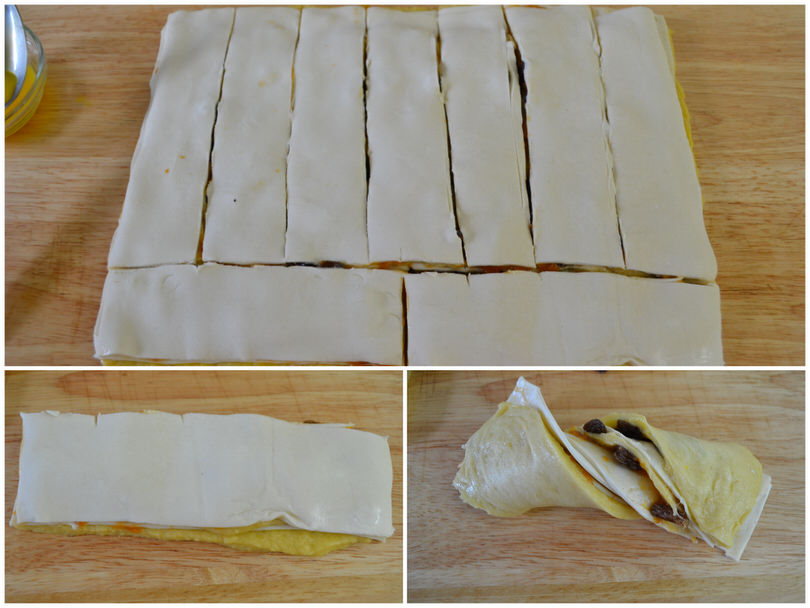 Stendete ora la pasta brioche e ritagliate 2 rettangoli delle stesse dimensioni del rettangolo di pasta sfoglia.Prendete un rettangolo di pasta brioche, spennellatelo con l’uovo sbattuto e distribuite sopra l'uvetta che avrete fato insaporire in rum e succo d'arancia e arancia candita.Adagiate sopra un rettangolo di pasta sfoglia e ricoprite con la marmellata di albicocca. Posizionate ora l'altro rettangolo di pasta brioche che spennellerete con uovo e farcirete con uvetta e arancia e terminate con il rettangolo di pasta sfoglia.