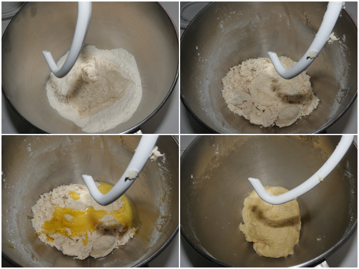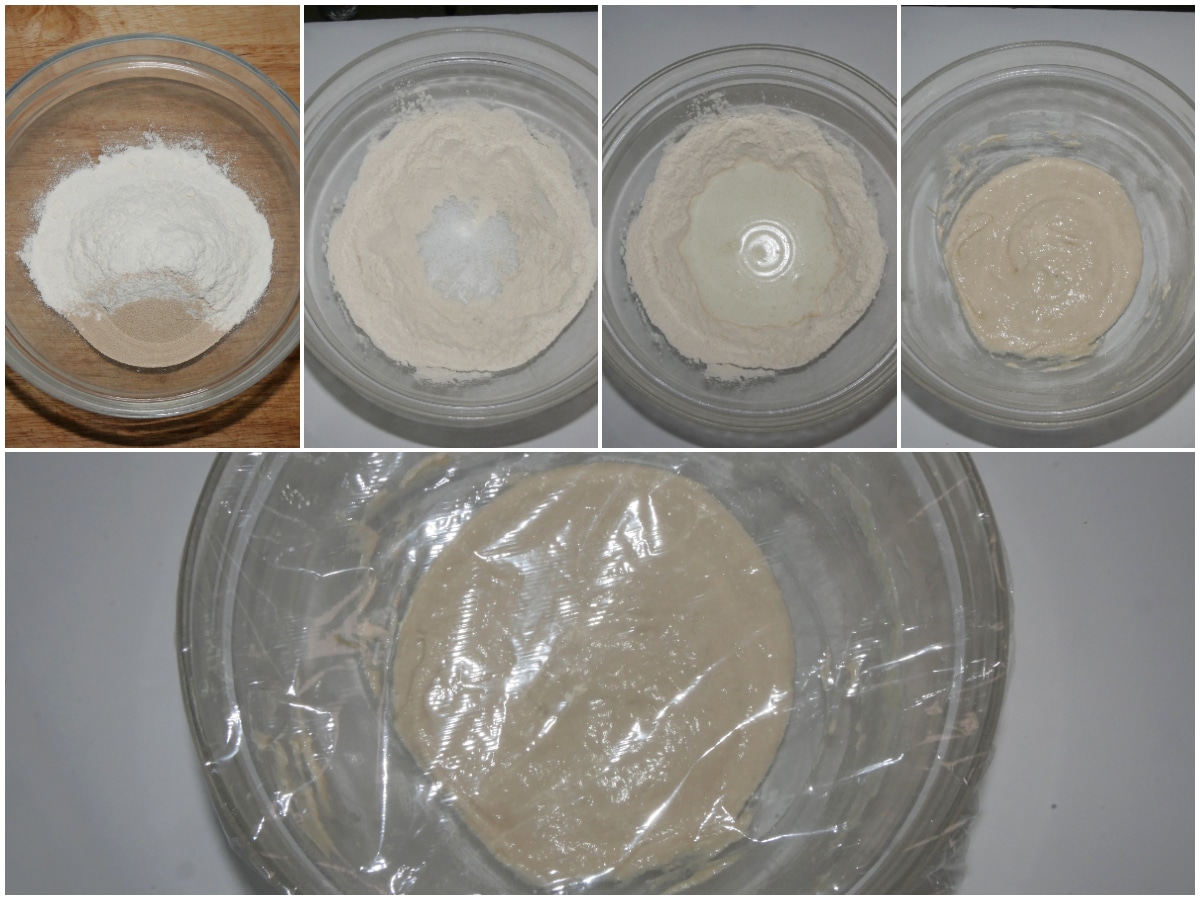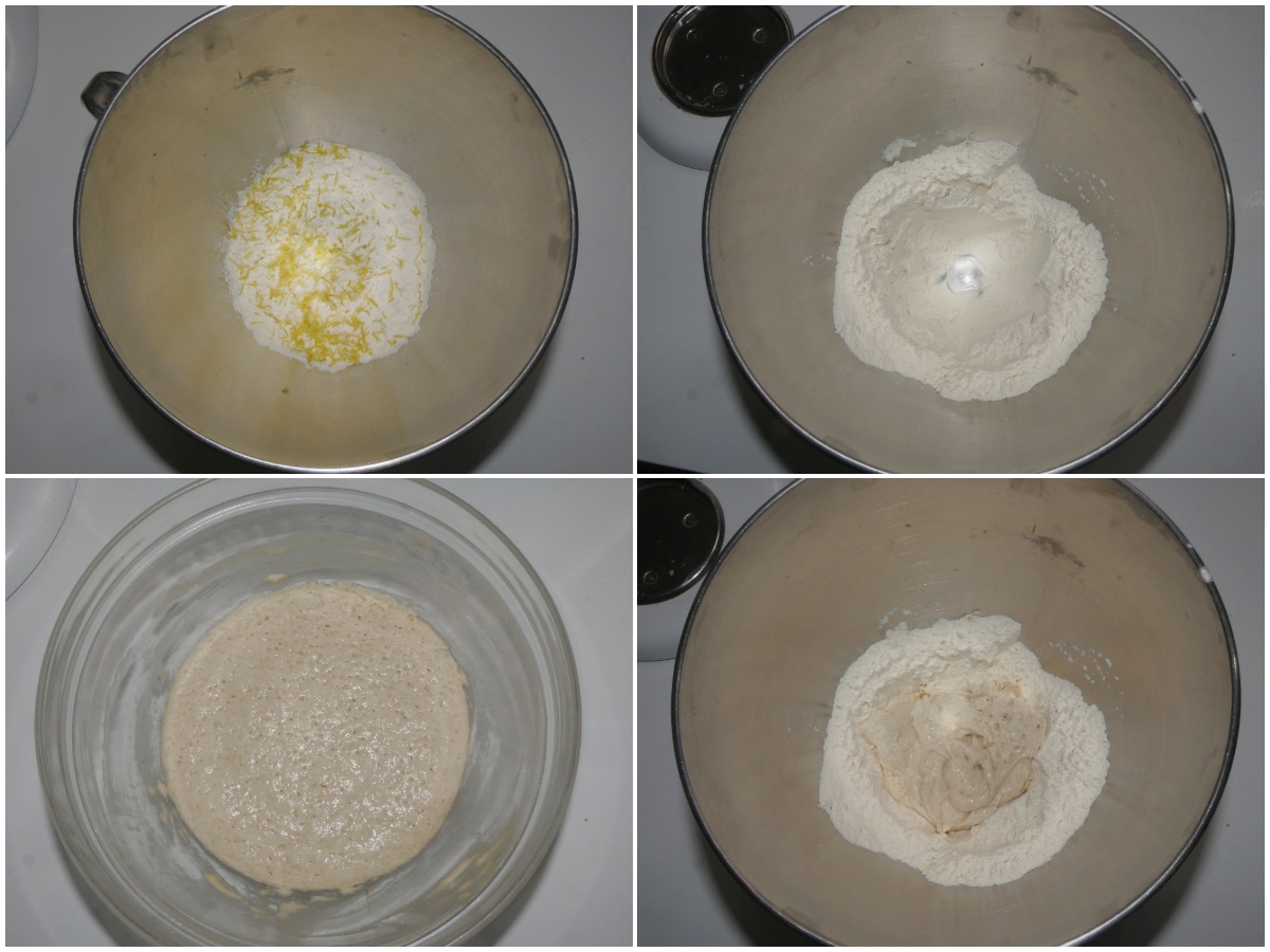 Preparare un lievitino facendo sciogliere il lievito nel latte appena tiepido, aggiungere 100 gr di farina e mescolare.Coprire la ciotola con la pellicola trasparente e far lievitare per 30 minuti