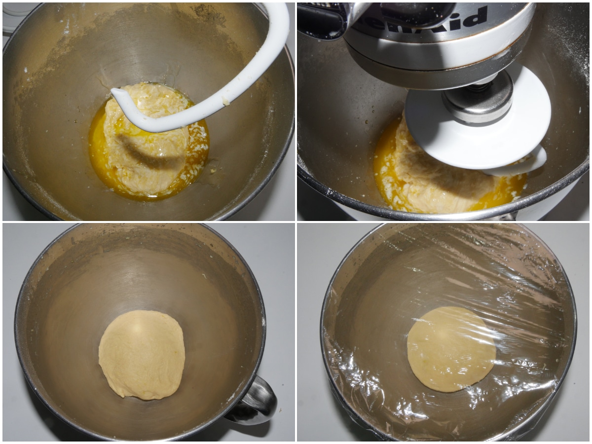 Aggiungere il composto di uova all'impasto e continuare a lavorare fino ad ottenere un panetto morbido e omogeneo aggiungendo gli altri 50 gr di farina se l'impasto risultasse tropo appiccicoso.