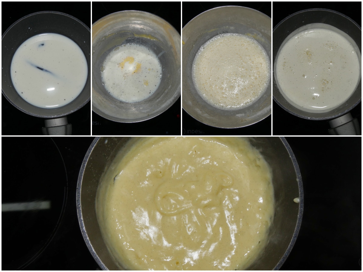 Aggiungere il latte a filo e un cucchiaio di essenza di vaniglia e mettere il composto sul fuoco.Cuocere la crema pasticcera a fiamma bassa mescolando di continuo. Lasciar cuocere fino a che la crema non sarà completamente addensata.