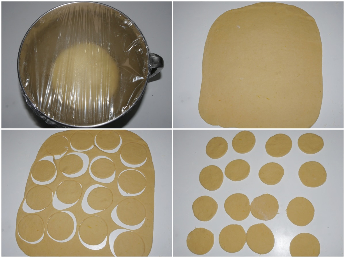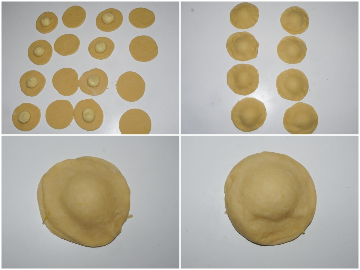 Riprendere ora la pasta, e stenderla su una spianatoia infarinata e con un mattarello fate una sfoglia con uno spessore di 4 mm, prendete un taglia pasta del diametro di 8cm e fare dei cerchietti di pasta.