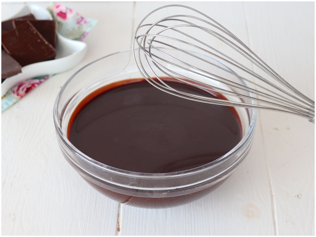 Preparate la glassa: unite il cioccolato a cubetti con la panna e fate sciogliere, in microonde o a bagnomaria, quindi mescolate fino ad ottenere una glassa lucida e omogenea.