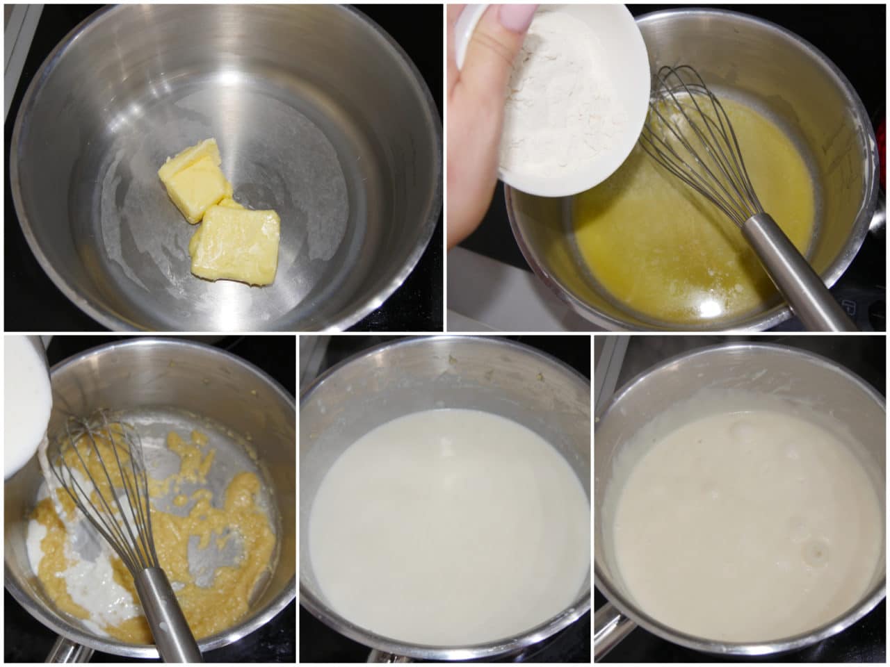 Nel frattempo preparate anche la besciamella: fate sciogliere il burro in un pentolino, aggiungete prima la farina (mescolate bene per evitare la formazione di grumi), poi incorporate il latte caldo, un pizzico di sale e noce moscata, e cuocete a fiamma lenta, mescolando costantemente, finché non si sarà addensata.