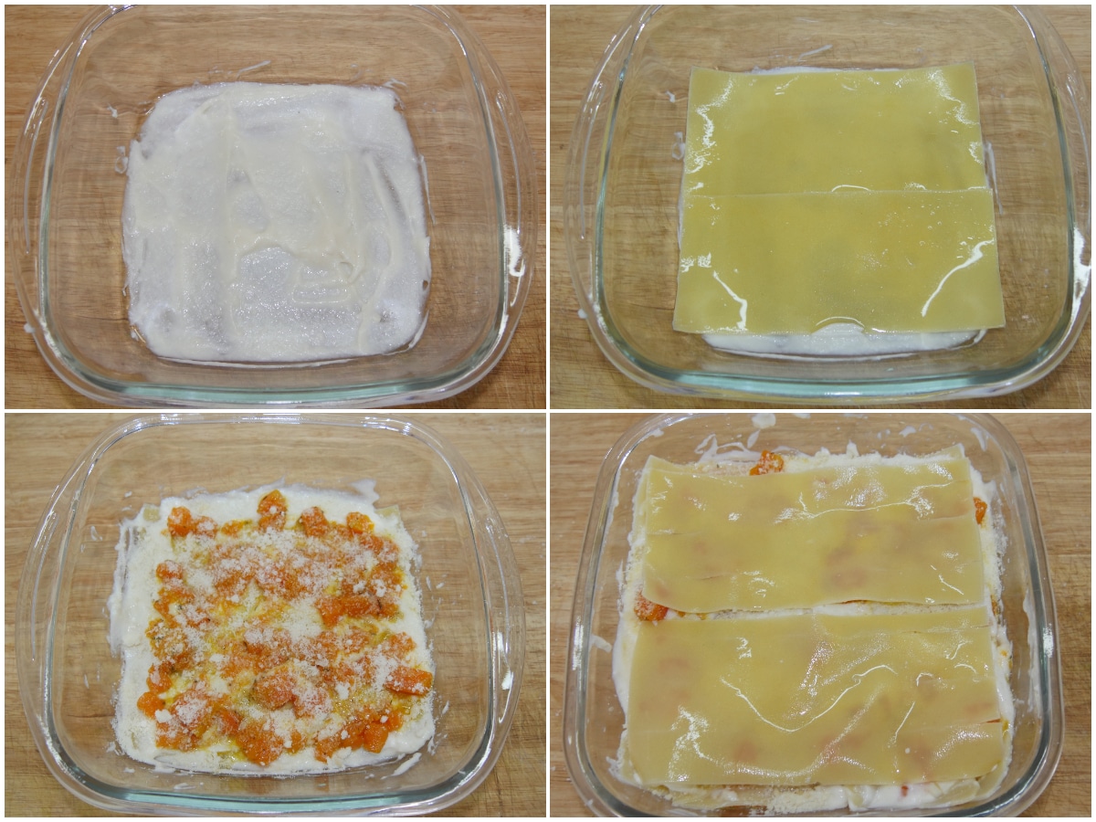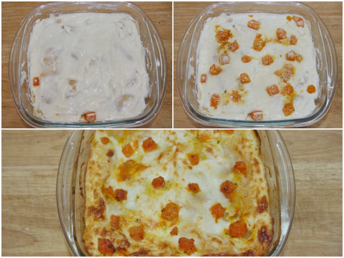 Concludete con besciamella e giusto qualche dadino di zucca e un pochino di parmigiano e cuocete per circa 30 minuti a 180°C, in forno statico già caldo.