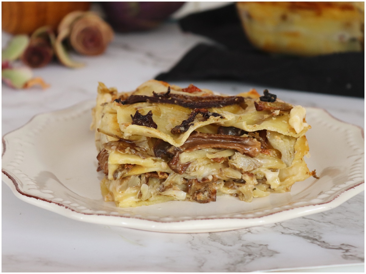 Le lasagne carciofi e funghi sono pronte: lasciatele riposare per almeno 5-10 minuti prima di servirle.