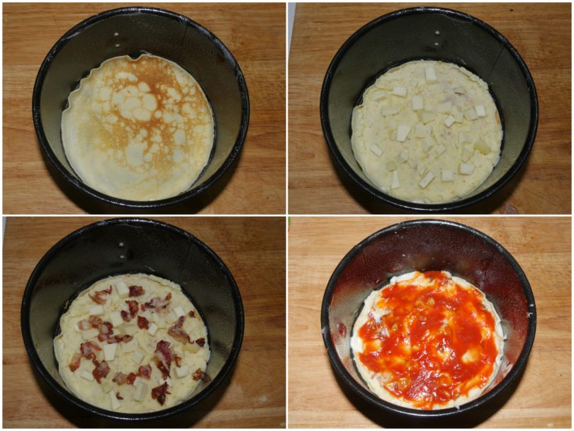 A questo punto iniziate ad assemblare la vostra lasagna: stendete poca besciamella sul fondo di una pirofila, quindi coprite con uno strato di crêpes Condite con patate, provolone a dadini, pancetta spezzettata, poca besciamella e salsa di pomodoro, quindi continuate a creare altri strati nello stesso modo.