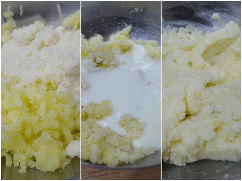 Quando le patate saranno pronte e le avrete sbucciate e schiacciate, insaporitele con 50 g di grana e una presa di sale e aggiungete il latte per renderle più cremose.