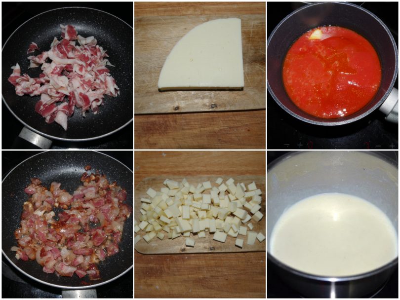 Tagliate la pancetta e fatela rosolare in padella, tagliate a cubetti il provolone, preparate la besciamella e preparate un sughetto al pomodoro.