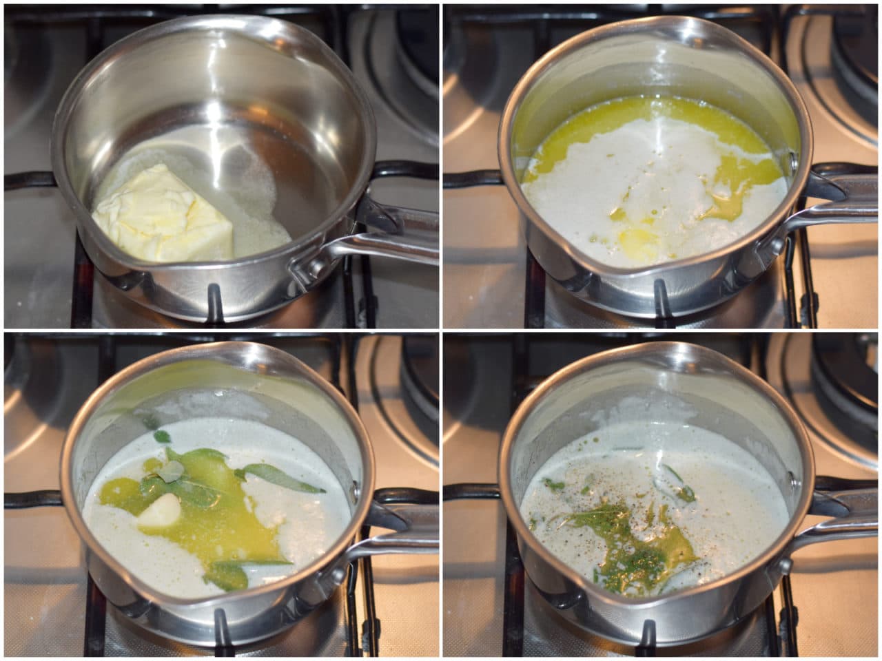 Innanzitutto sciogliete il burro insieme con l'olio in una casseruola, poi unite aglio e salvia e lasciate insaporire, quindi condite con sale e pepe.