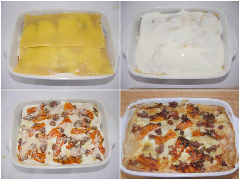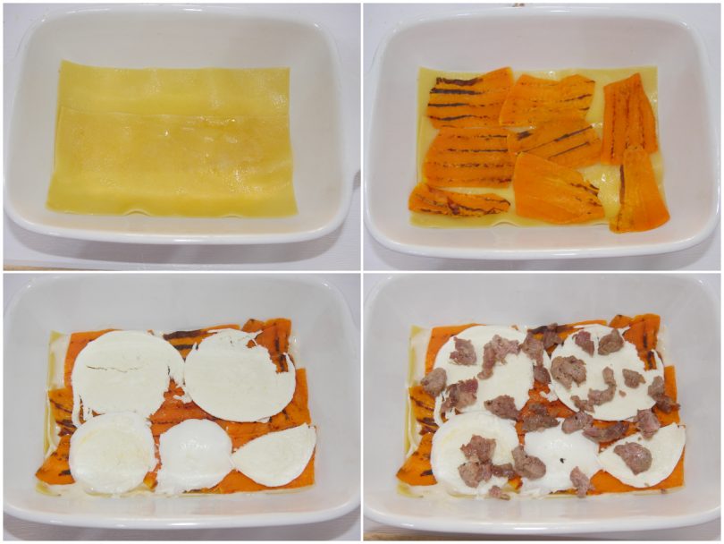 Ricoprite con un altro strato di lasagna, mettete un velo di besciamella e poi ancora zucca, salsicce e mozarella