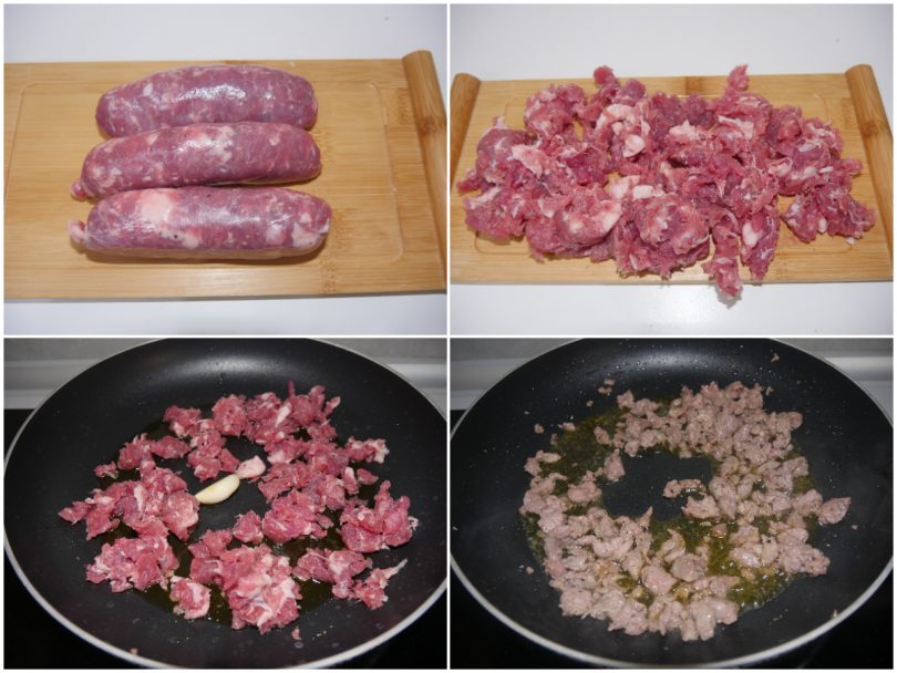 Nel frattempo eliminate il budello dalle salsiccie, sbriciolatele e cuocete in padella per 5/10 minuti con un filo d'olio e uno spicchio d'aglio. Sfumate con il vino bianco e salate