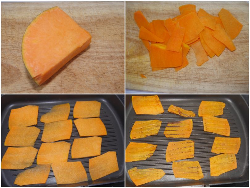 Per prima cosa sbucciate e affettate la zucca, Poi grigliatele le fette da entrambe i lati.
