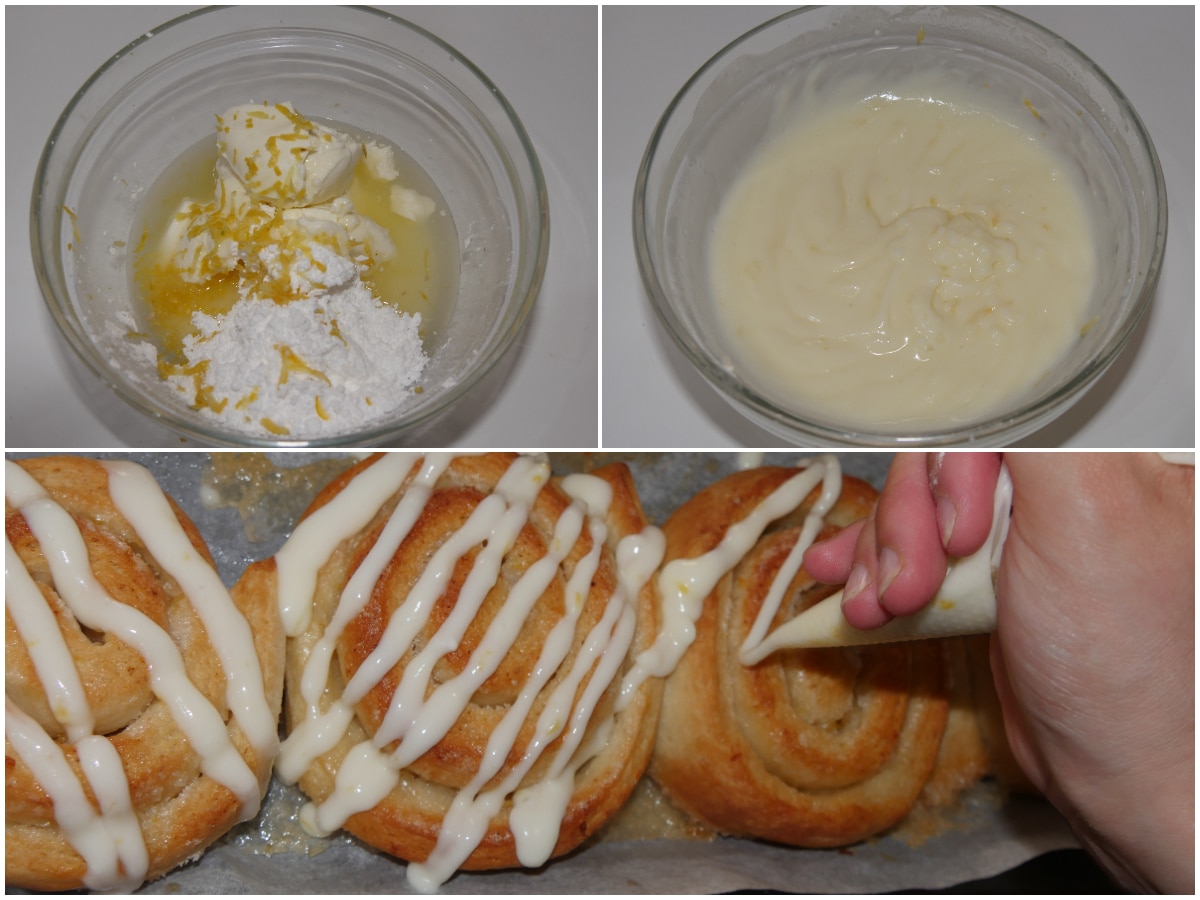 Lasciate raffreddare per bene i rolls, poi preparate la glassa lavorando il formaggio con zucchero, succo di limone e buccia grattugiata.