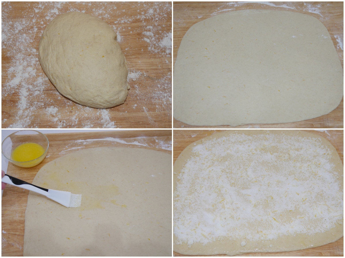 Una volta raddoppiato l'impasto, riprendetelo, sgonfiatelo delicatamente con le mani e stendetelo sulla spianatoia infarinata, creando una sfoglia rettangolare (da 48x35 cm circa), che andrete a spennellare con il burro e poi a cospargere con lo zucchero al limone.