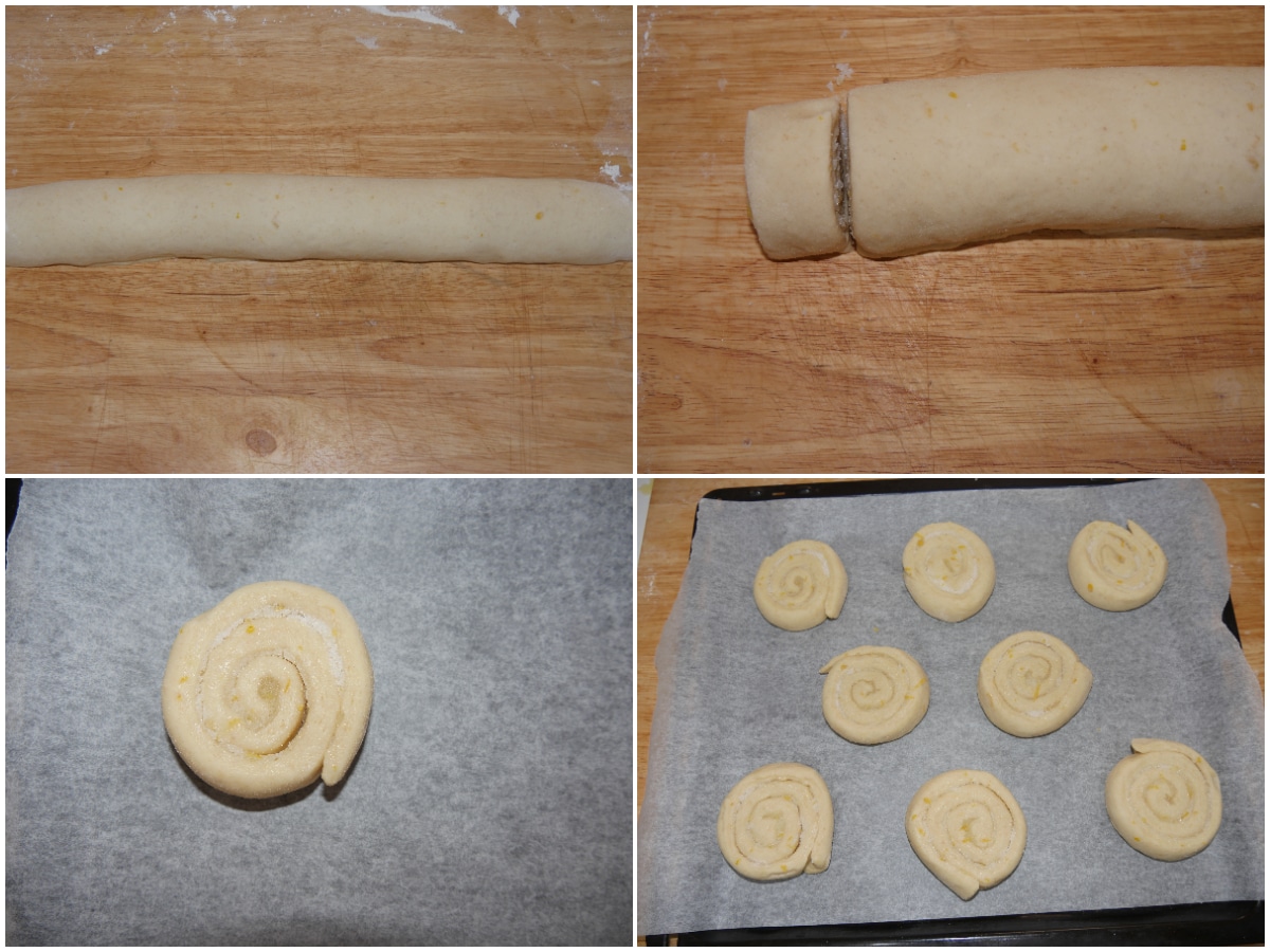 Arrotolate strettamente la sfoglia su se stessa dal lato più lungo, quindi dividete in 12 girelle da circa 4 cm l'una, disponendole man mano sulla teglia rivestita di carta forno, ben distanziate tra loro.