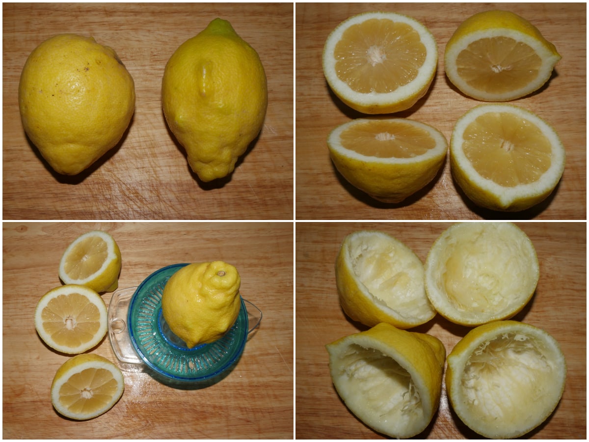 Innanzitutto lavate molto bene i limoni sotto acqua corrente, quindi tagliateli a metà e spremetene il succo, cercando di non rompere la buccia, in modo che resti una sorta di guscio.