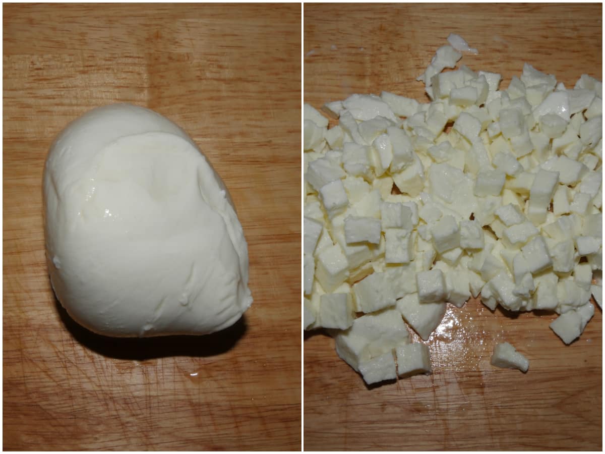 Nel frattempo tagliate la mozzarella a cubetti e lasciatela asciugare un pochino in frigo.
